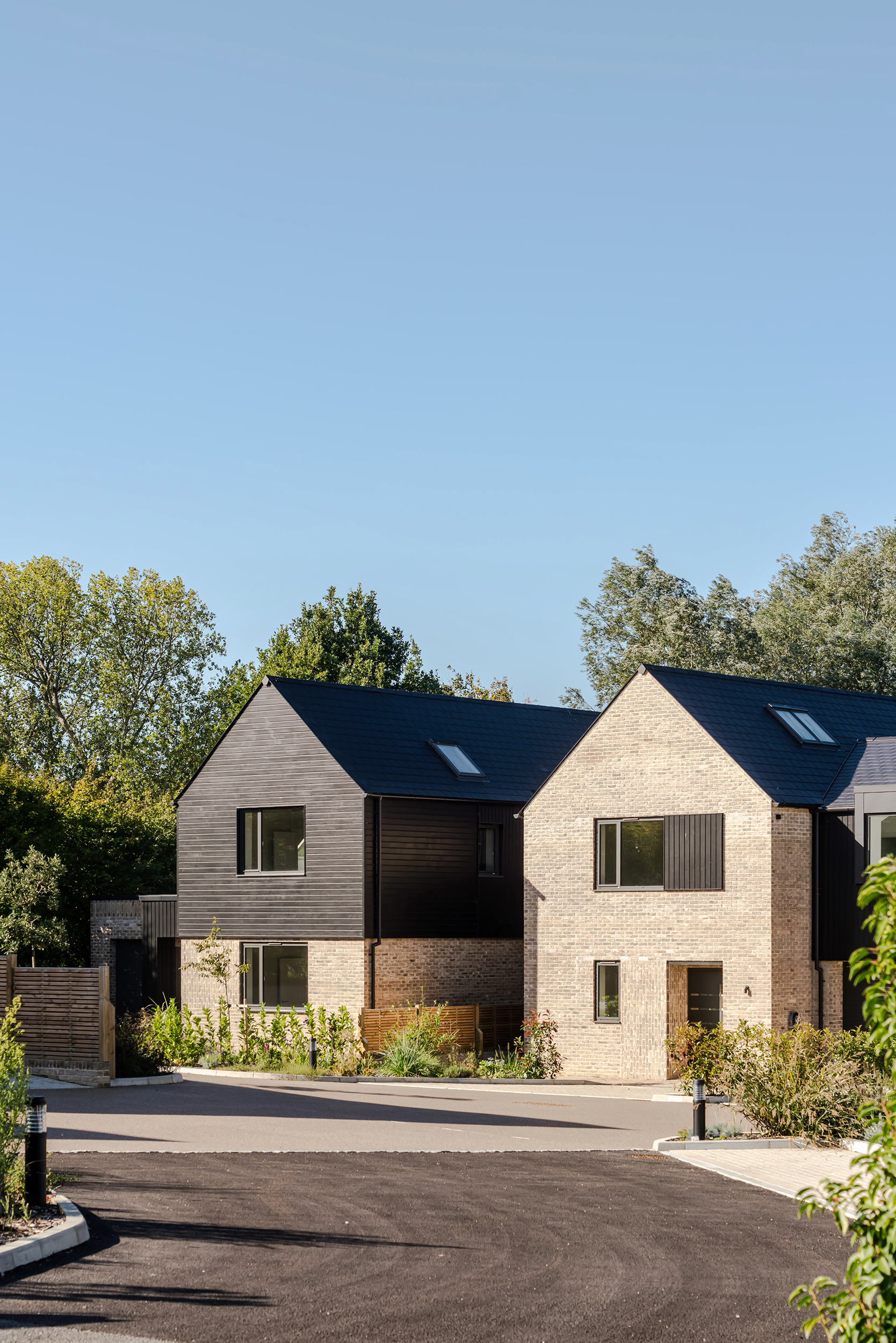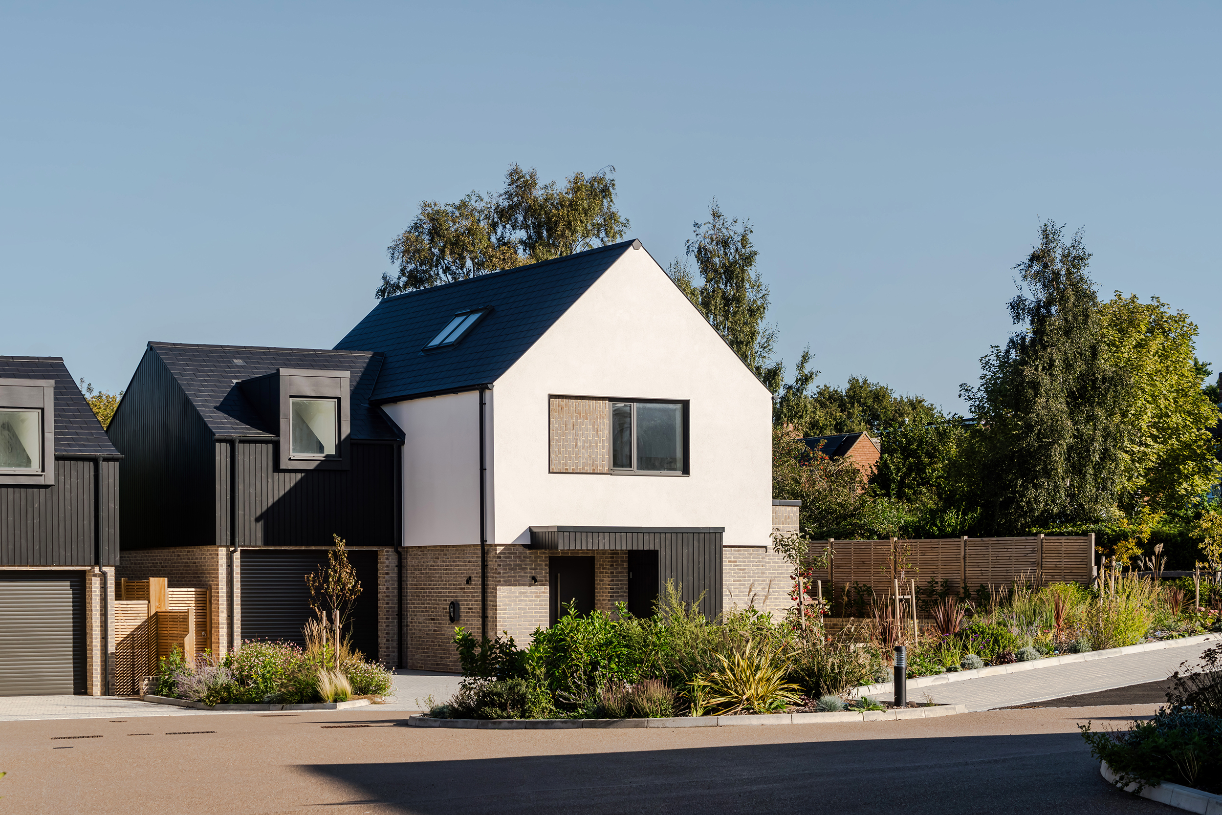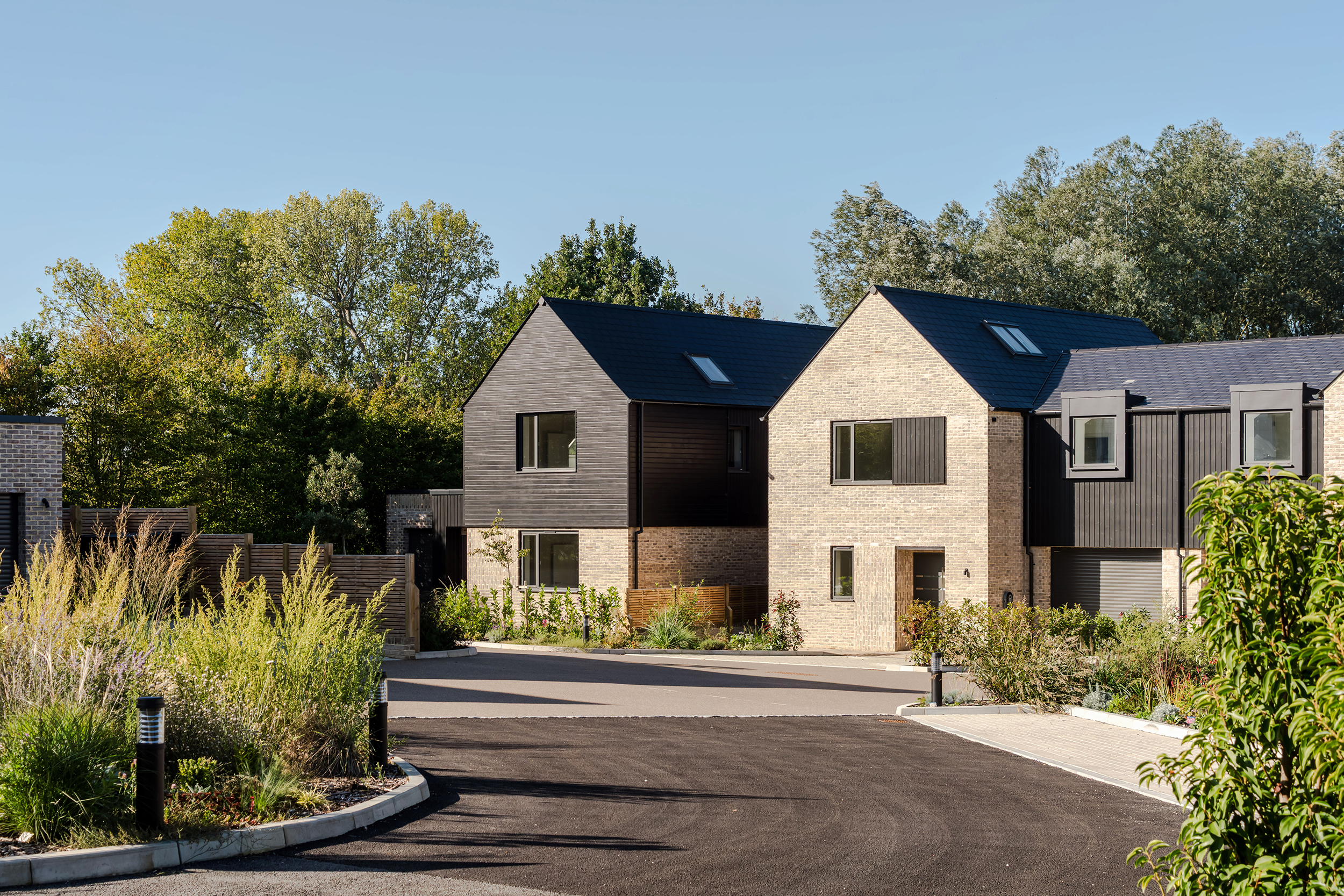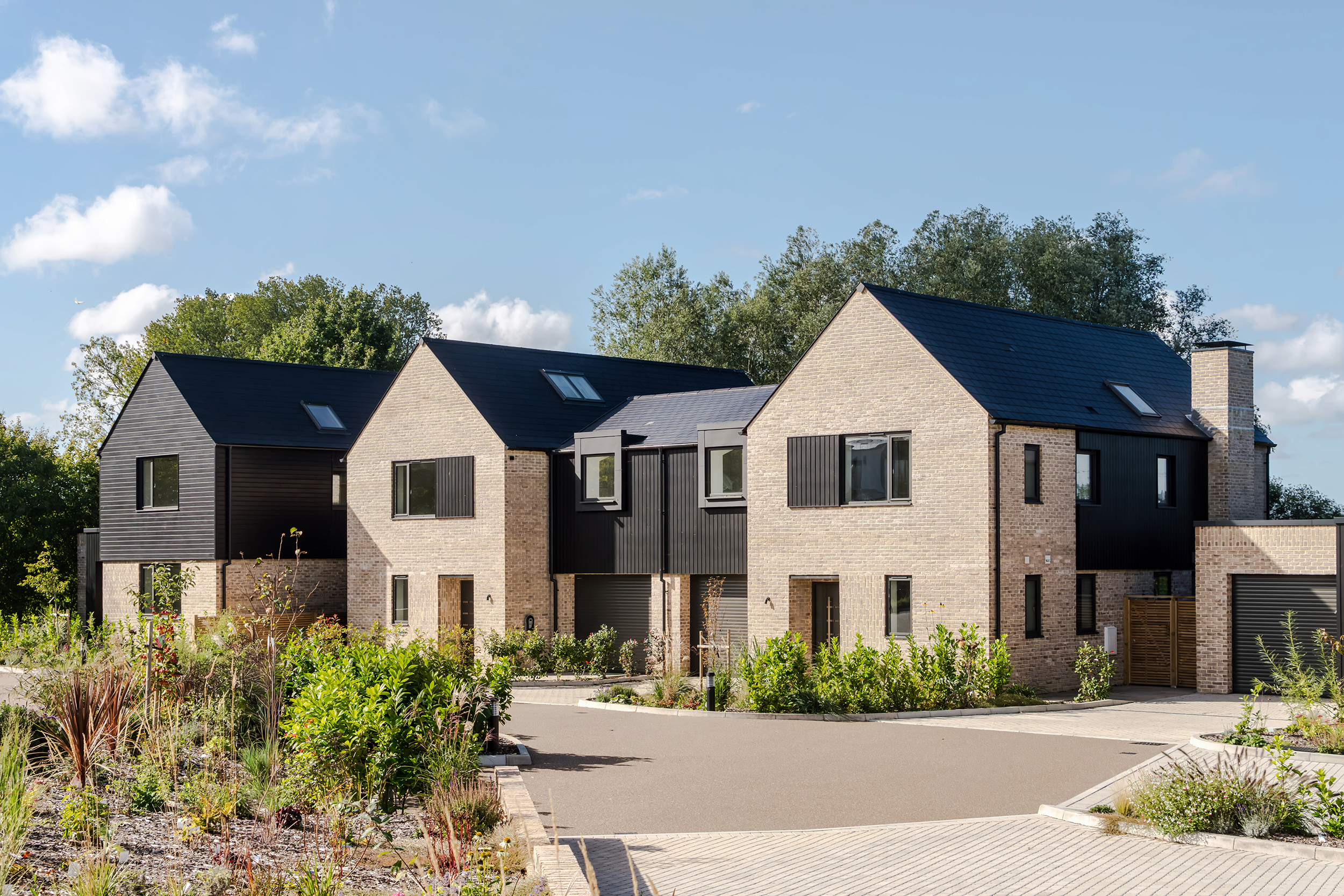 The houses combine a mix of materials, natural render, buff bricks, black stained timber cladding, slate and zinc, to add interest across the development and to blend the differing property types as you move through the site. The ground floors are mostly open plan, with large sliding doors to the rear overlooking generous private garden spaces.