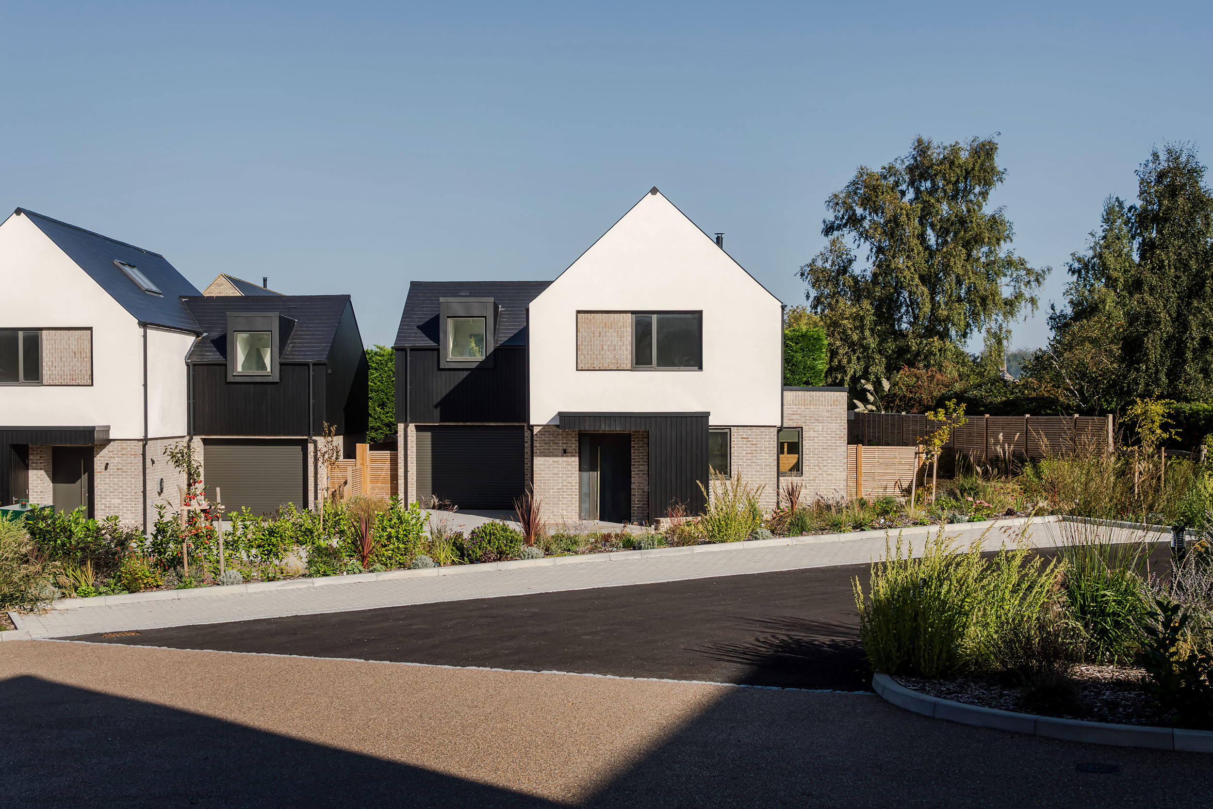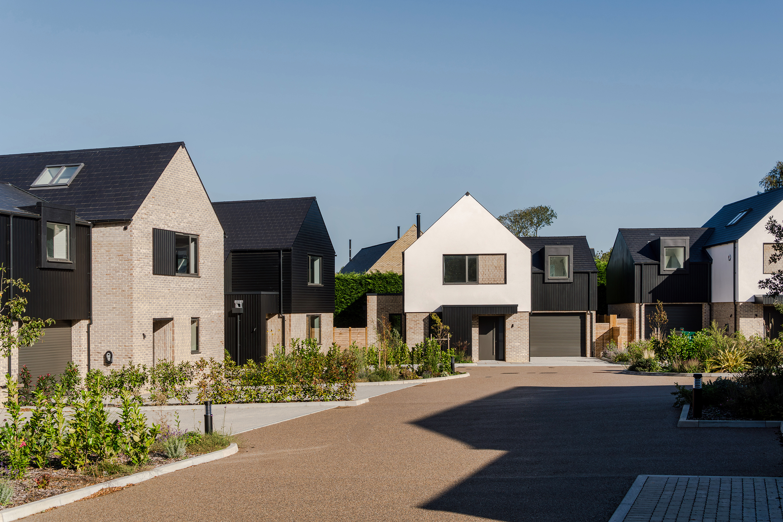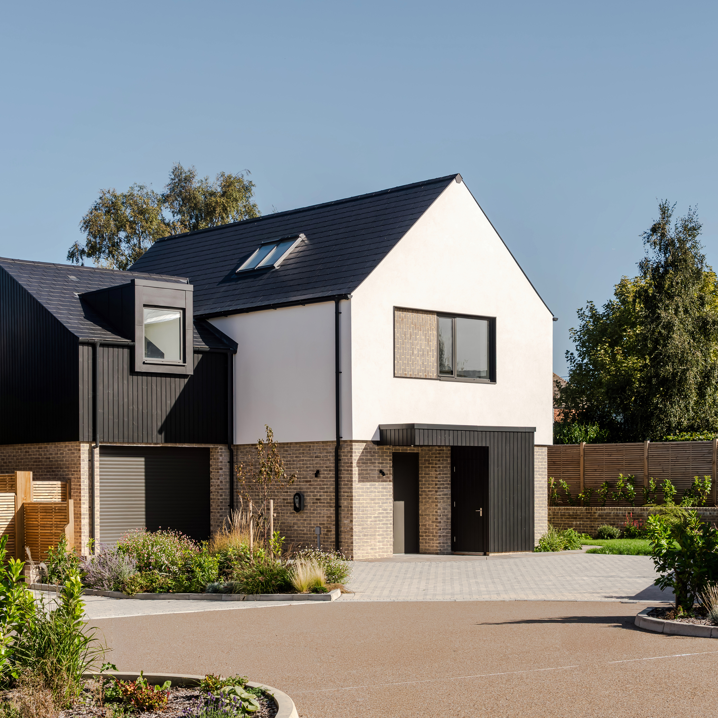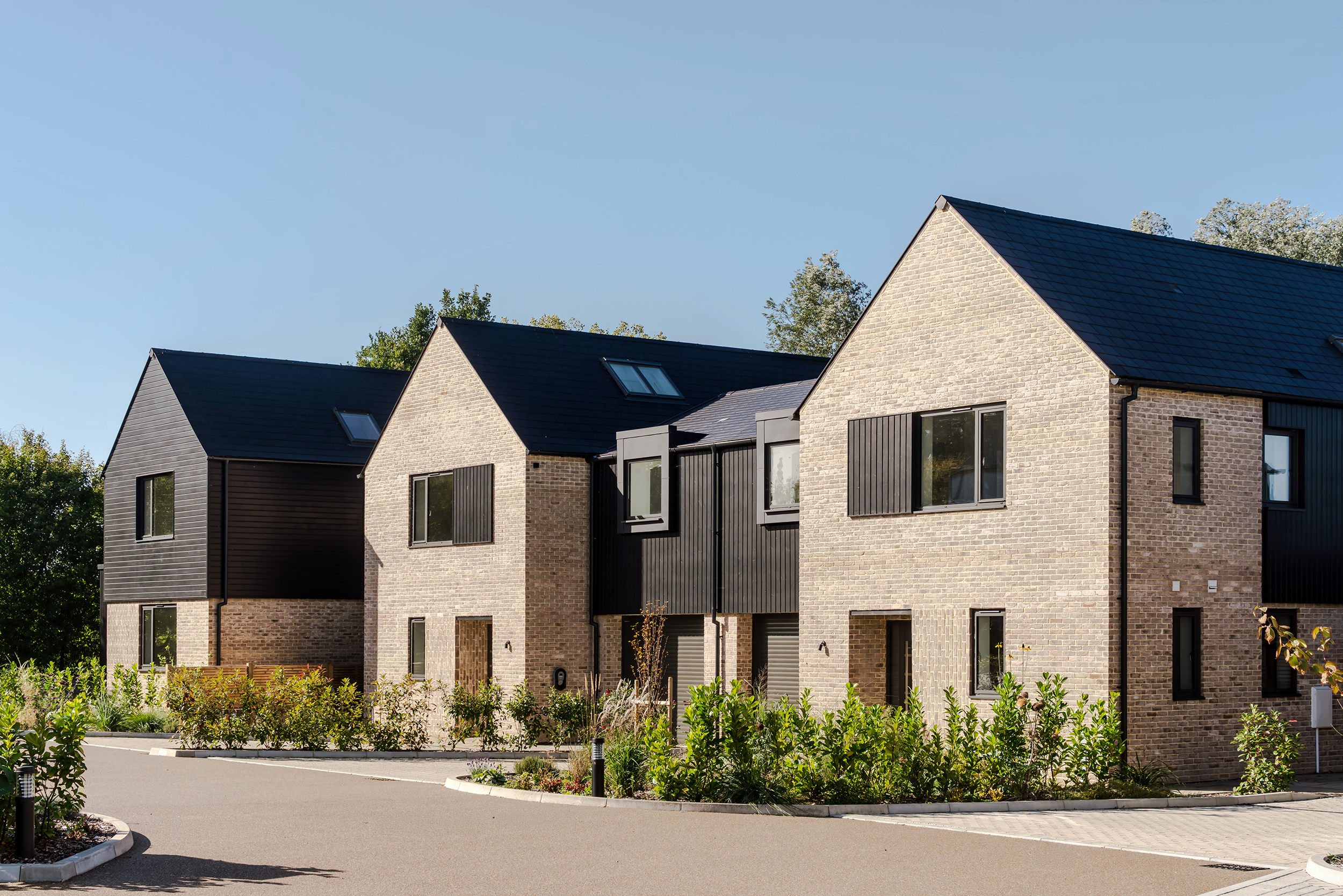The houses combine a mix of materials, natural render, buff bricks, black stained timber cladding, slate and zinc, to add interest across the development and to blend the differing property types as you move through the site. The ground floors are mostly open plan, with large sliding doors to the rear overlooking generous private garden spaces.