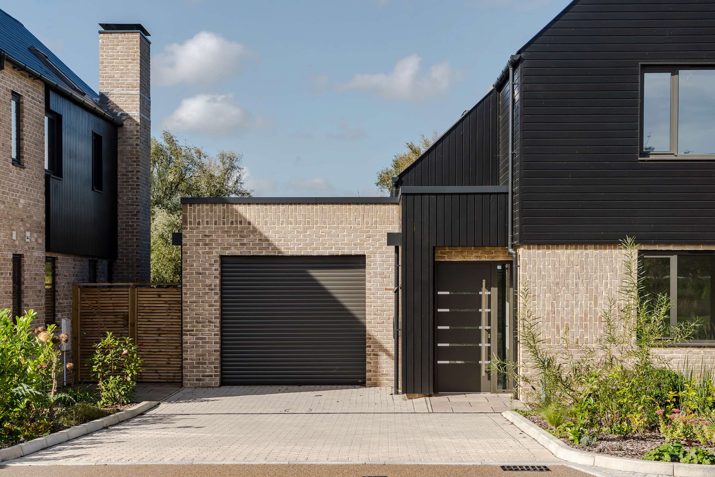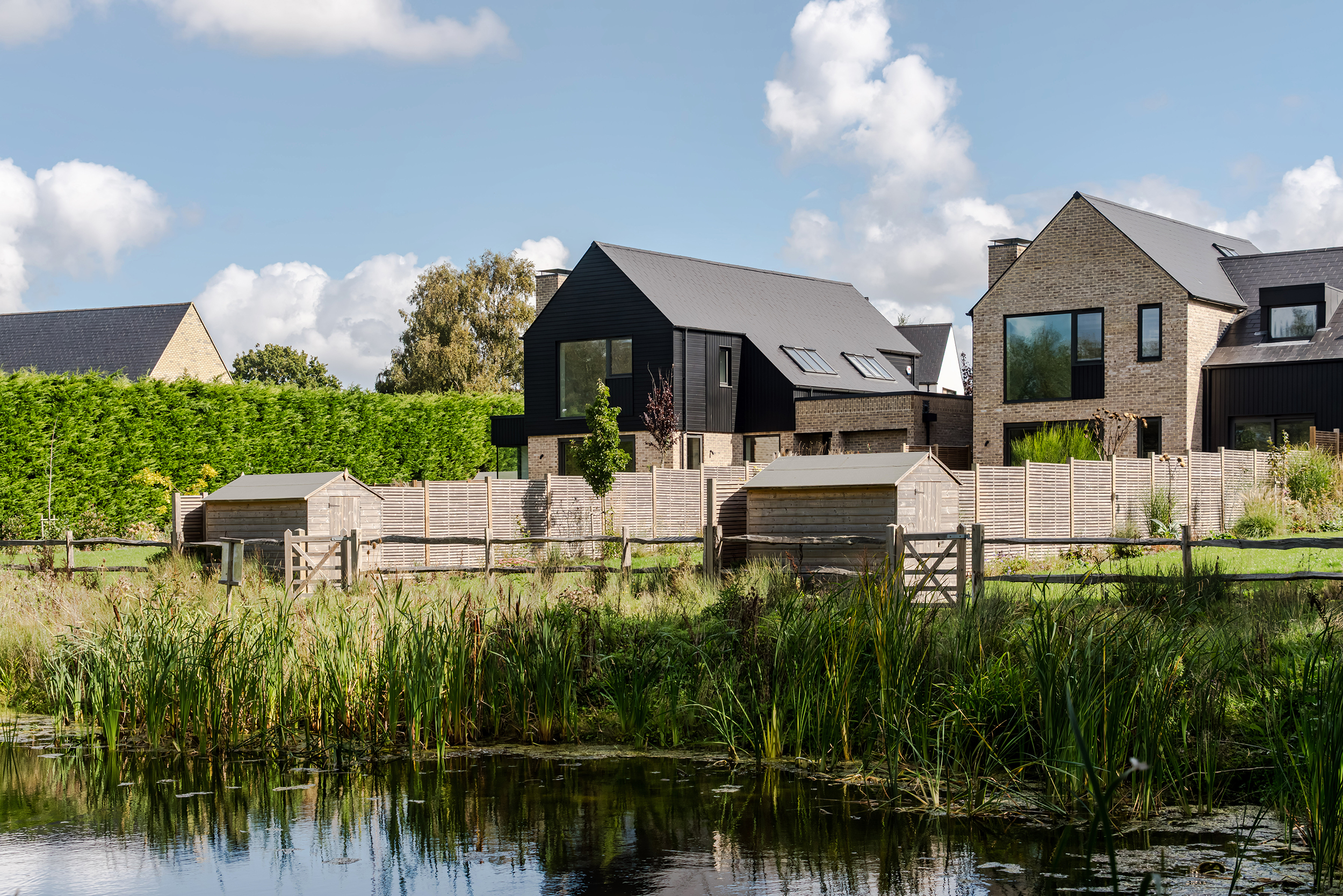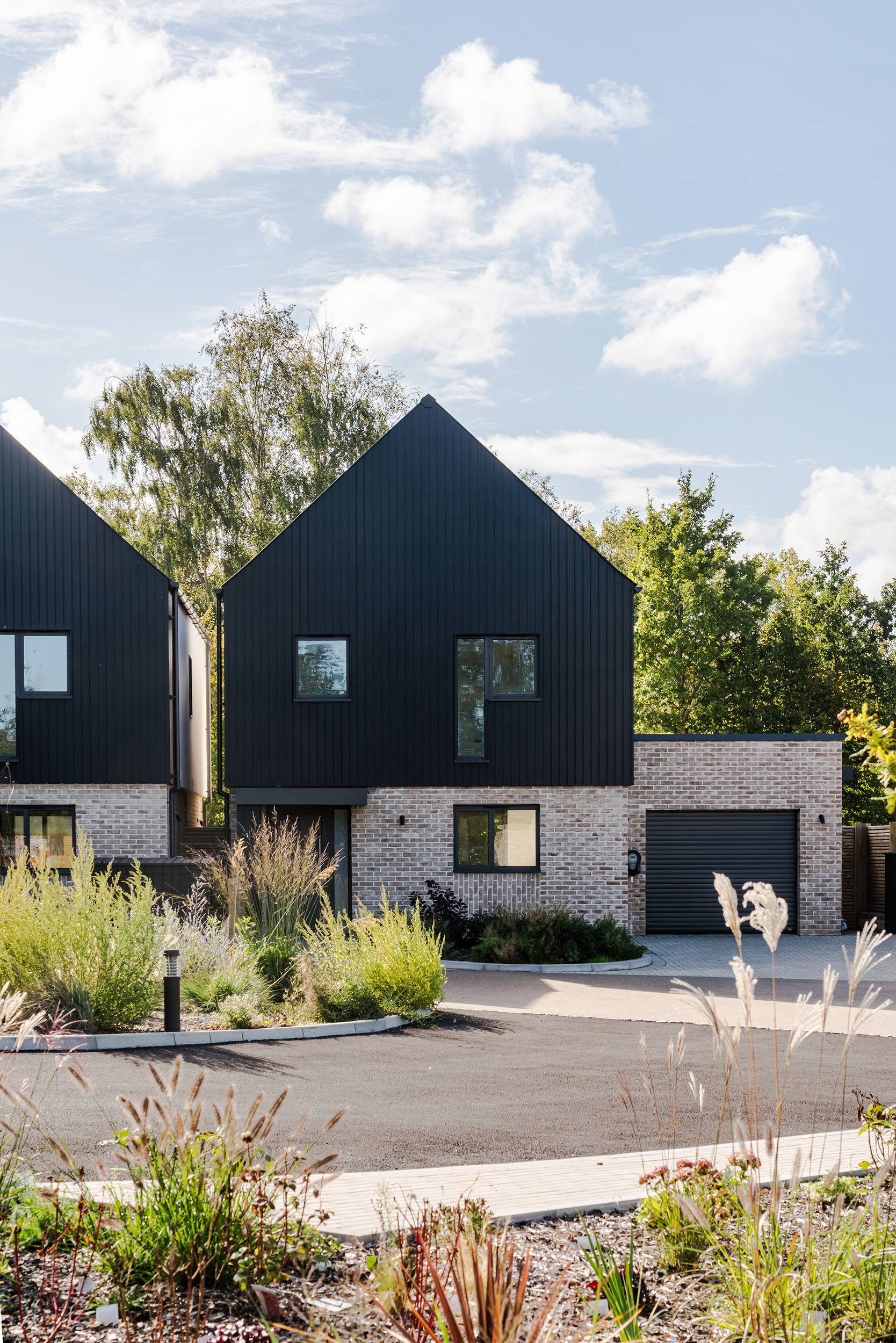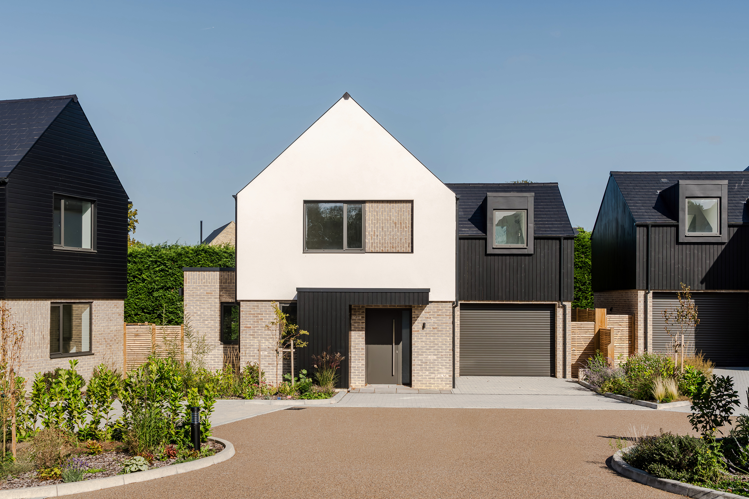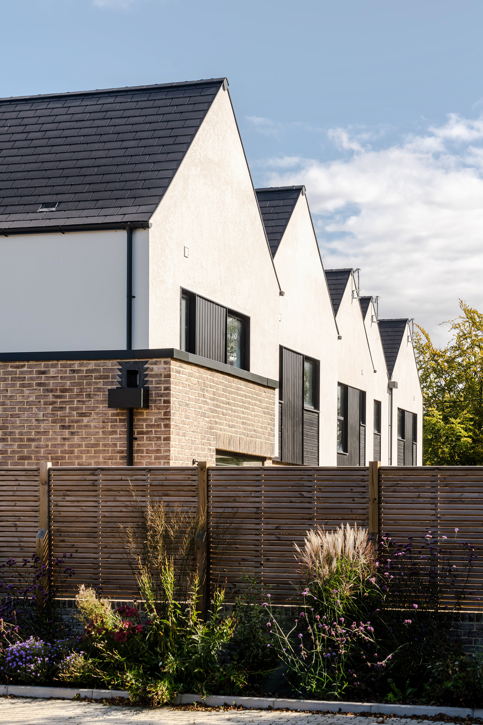 The houses combine a mix of materials, natural render, buff bricks, black stained timber cladding, slate and zinc, to add interest across the development and to blend the differing property types as you move through the site. The ground floors are mostly open plan, with large sliding doors to the rear overlooking generous private garden spaces.
