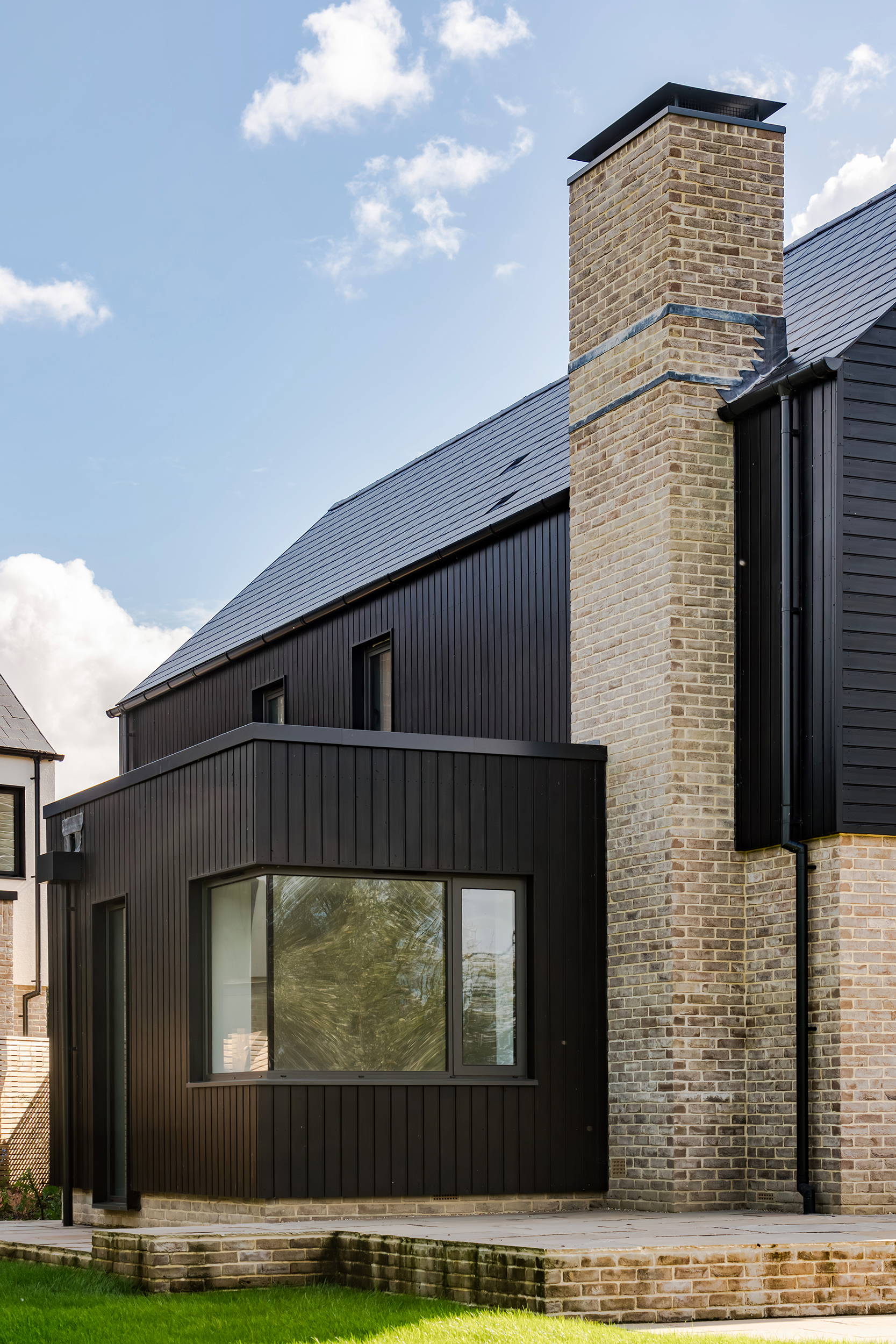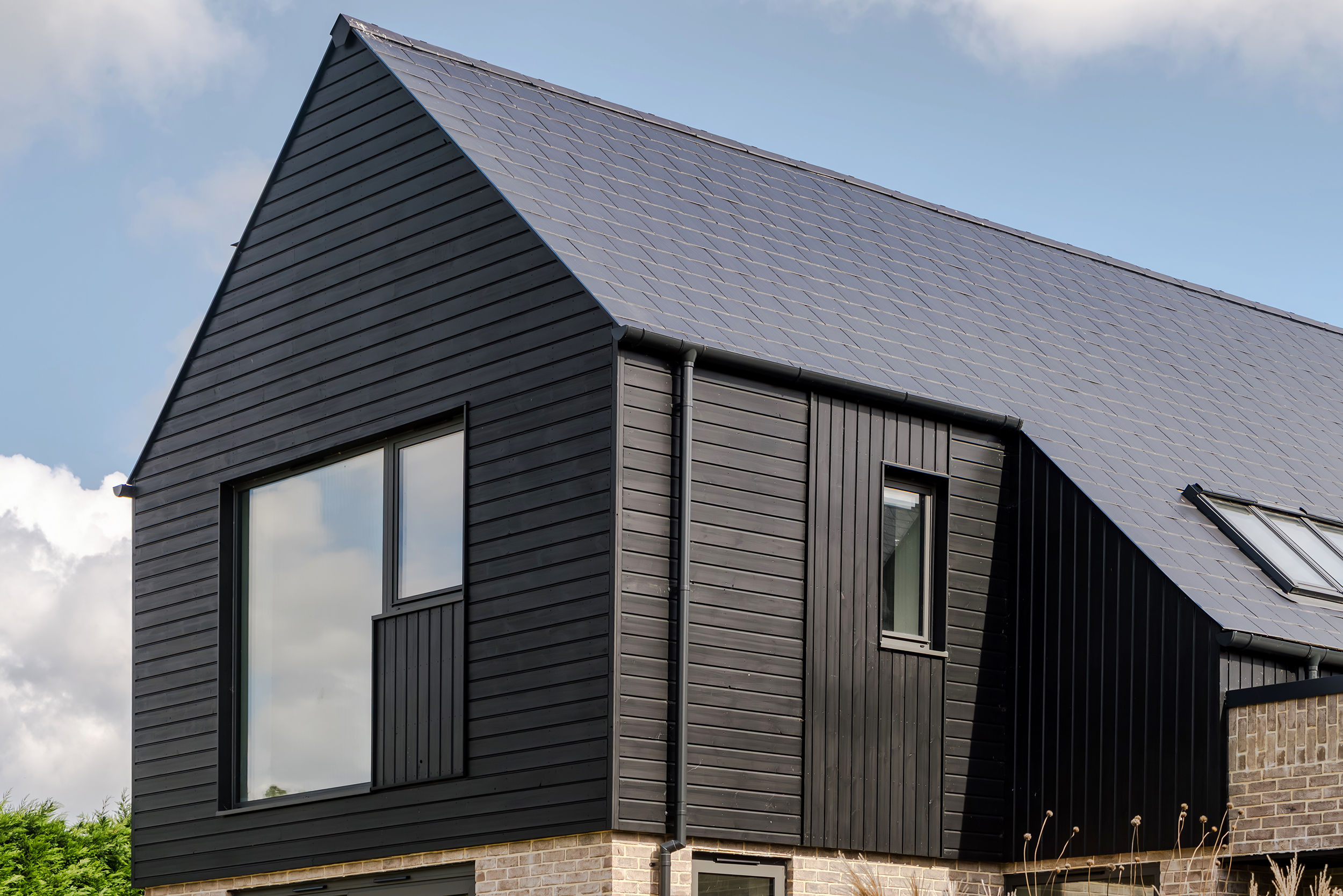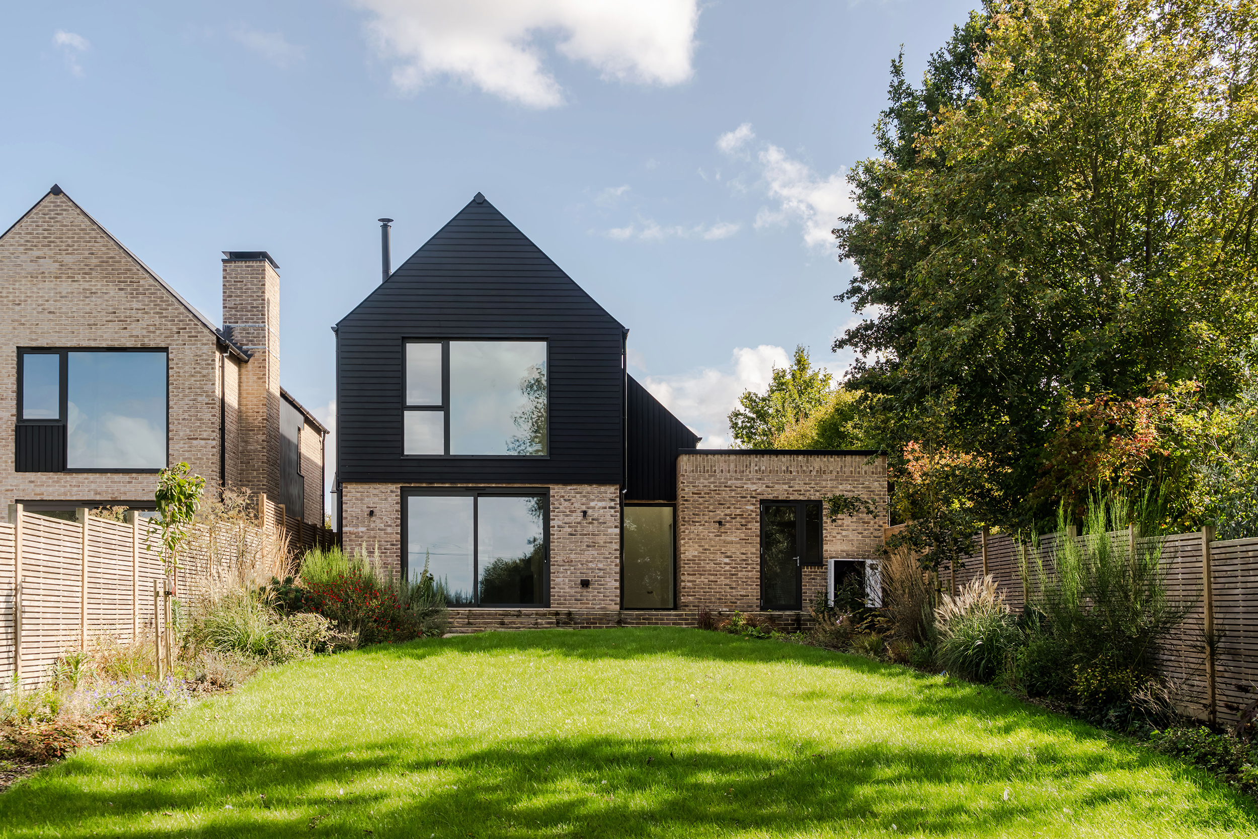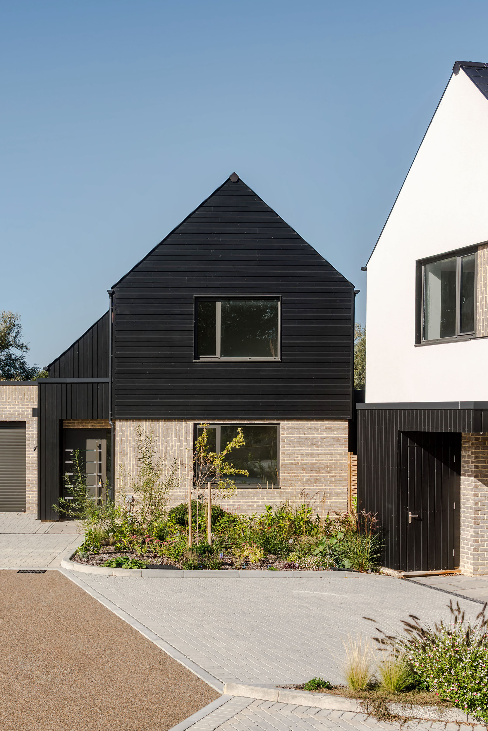 The houses combine a mix of materials, natural render, buff bricks, black stained timber cladding, slate and zinc, to add interest across the development and to blend the differing property types as you move through the site. The ground floors are mostly open plan, with large sliding doors to the rear overlooking generous private garden spaces.